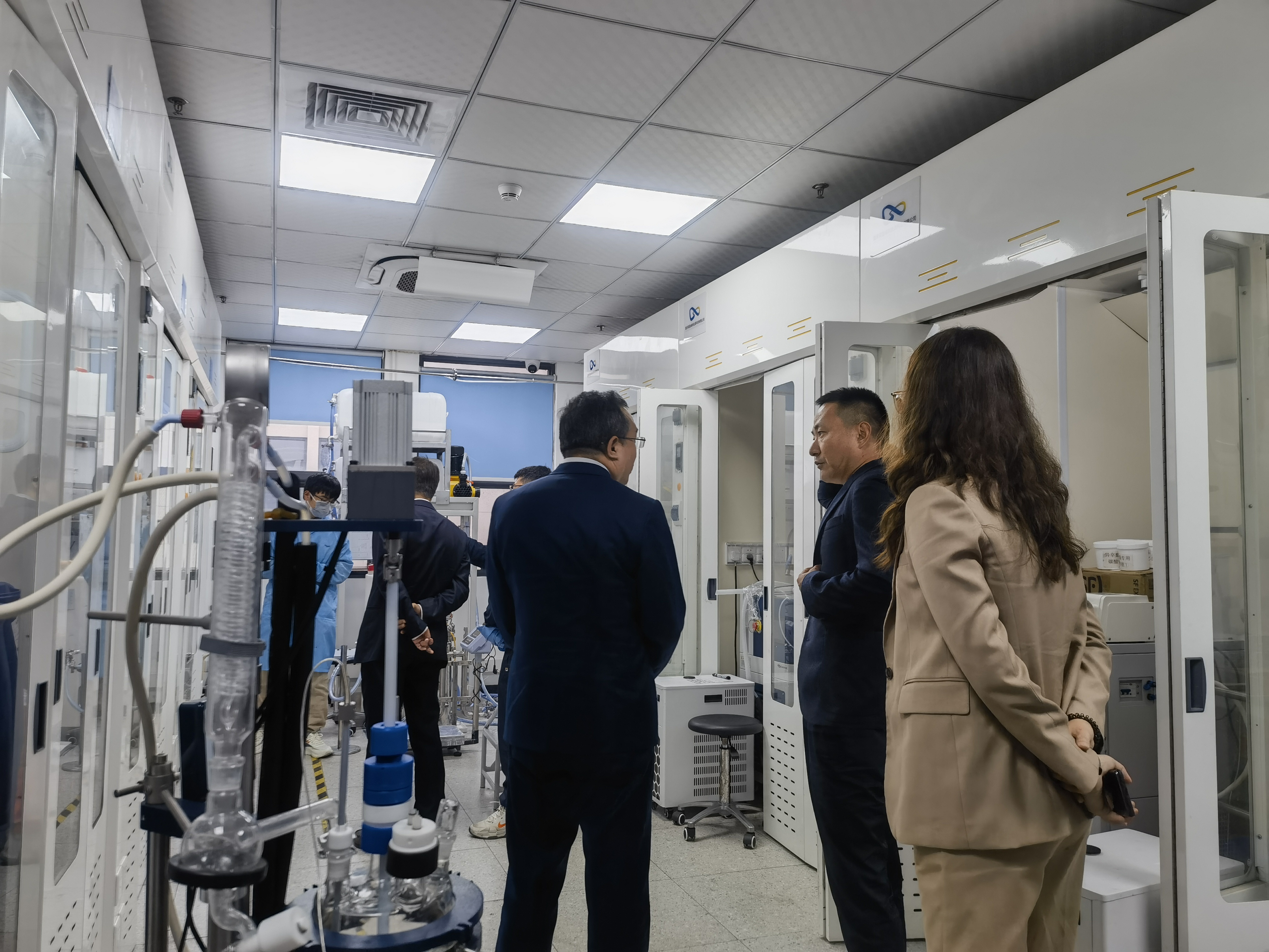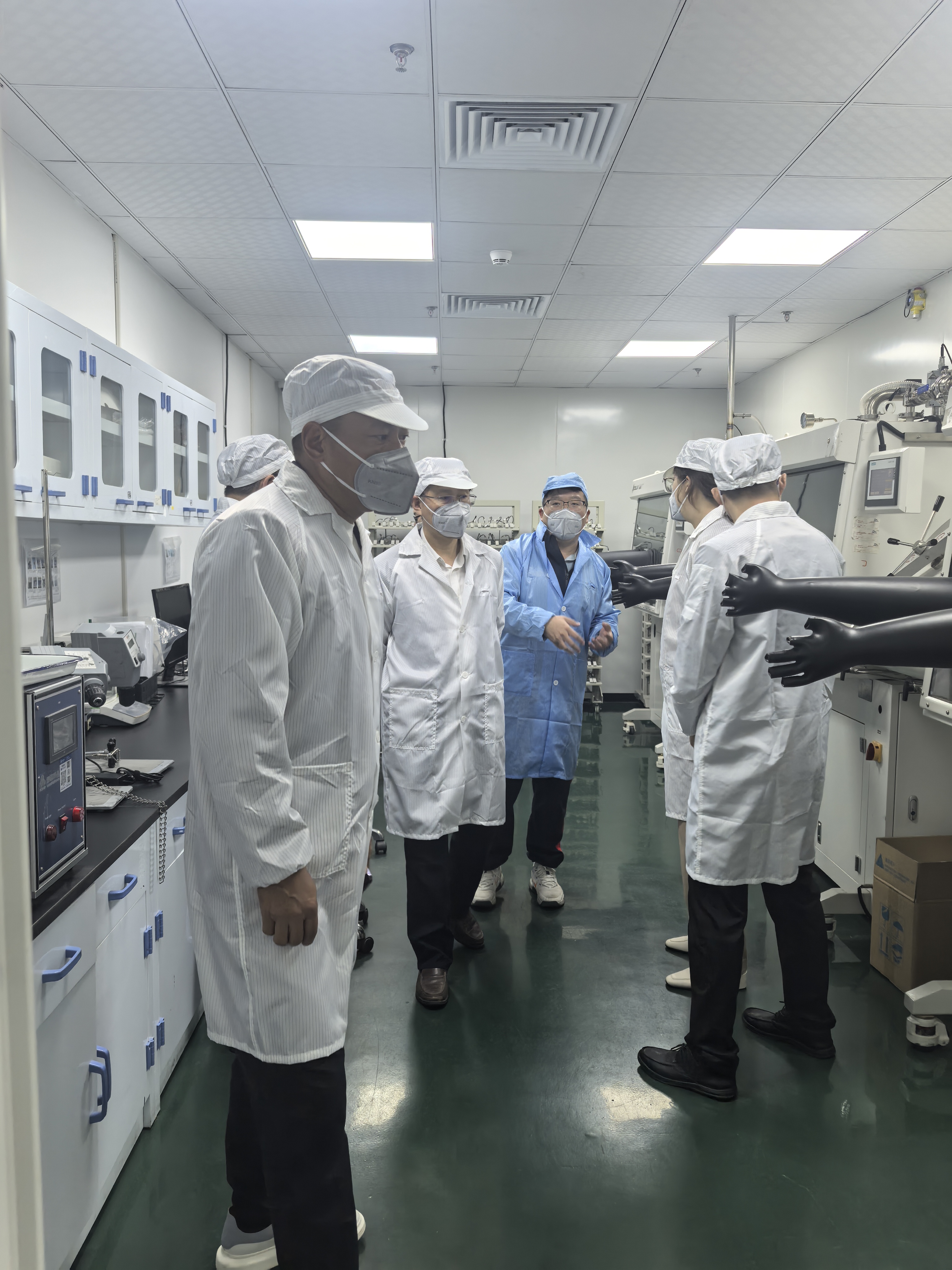在公司董事長閆興的介紹下,王德平院長一行進入碩盈峰研究院實驗區域參觀考察。碩盈峰總部研究院實驗區域占地約2000平米,涵蓋高分子材料合成、材料表征、軟包/扣式電池試制產線以及電池全性能測試等實驗功能。王德平院長一行深入了解了碩盈峰研發過程中的各個實驗環節,對碩盈峰在研發方面的投入給予高度的肯定。